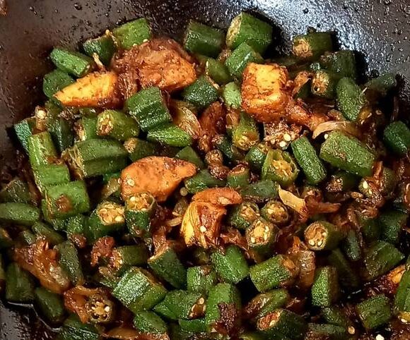 Hühnerbrust und Okra gekocht mit Zwiebeln, Tomaten und Gewürzen